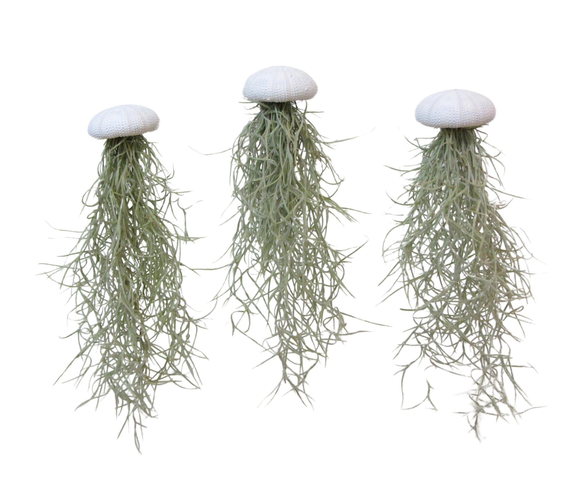 Seeigel weiß 3er Set mit spanischem Moos Tillandsie