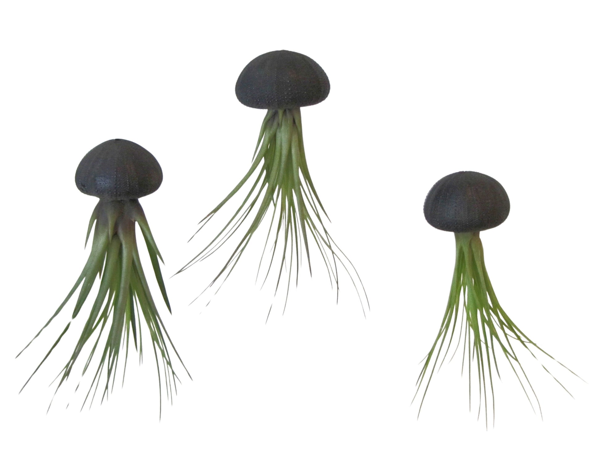 3er Set bezaubernde Kombination aus Seeigelgehäuse schwarz mit jeweils einer echten, lebenden Tillandsie mit Aufhängung