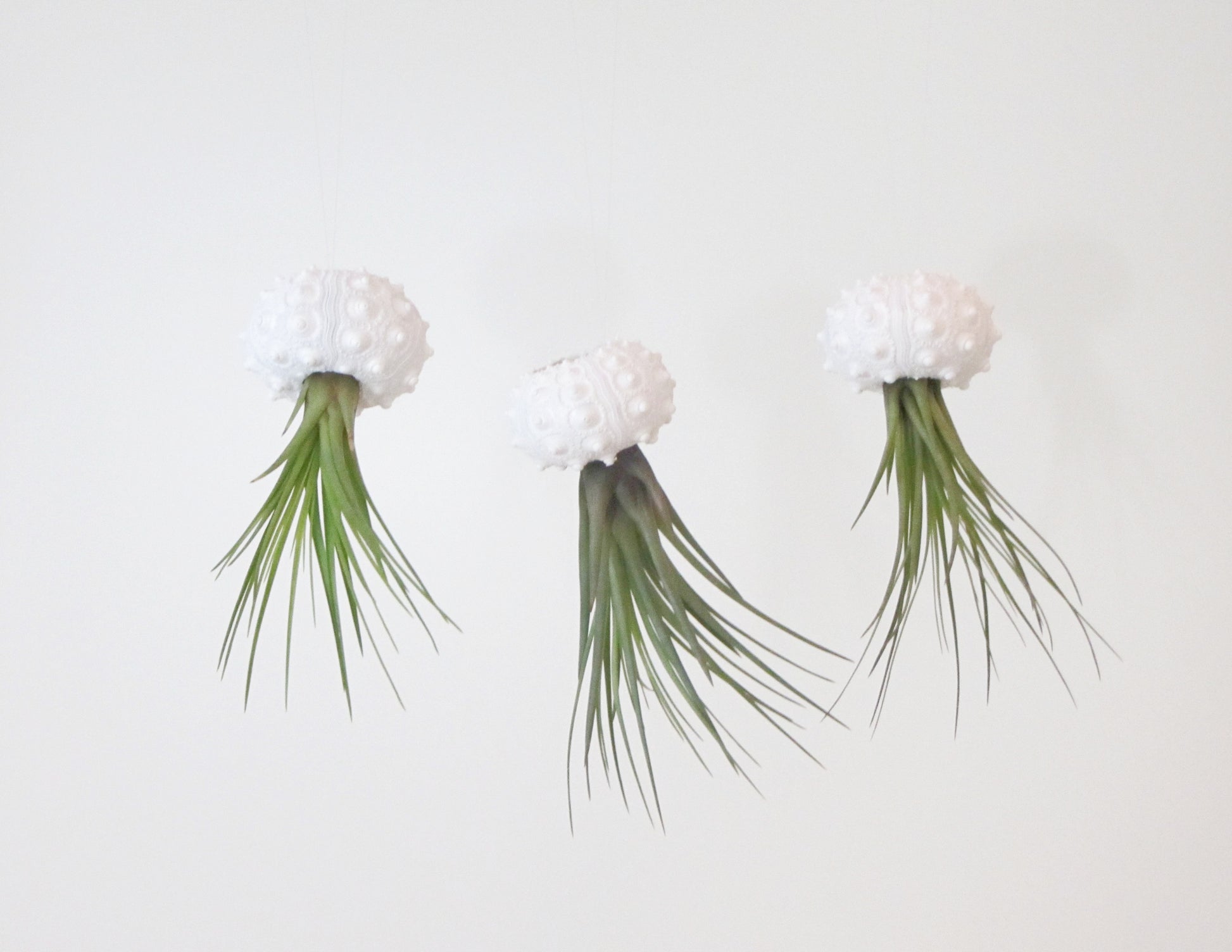 3er Set bezaubernde Kombination aus Seeigelgehäuse weiß und jeweils einer echten, lebenden Tillandsie mit Aufhängung