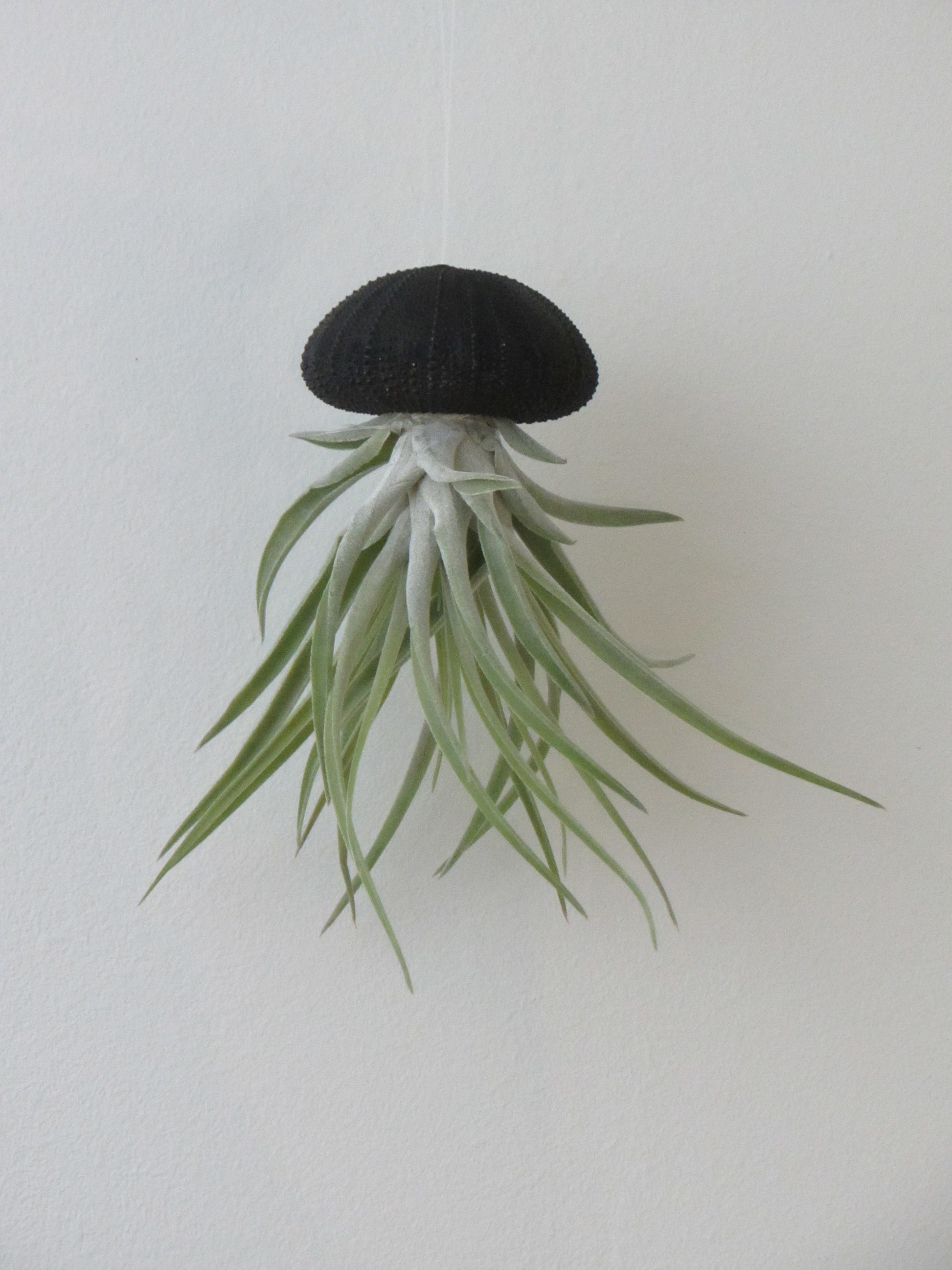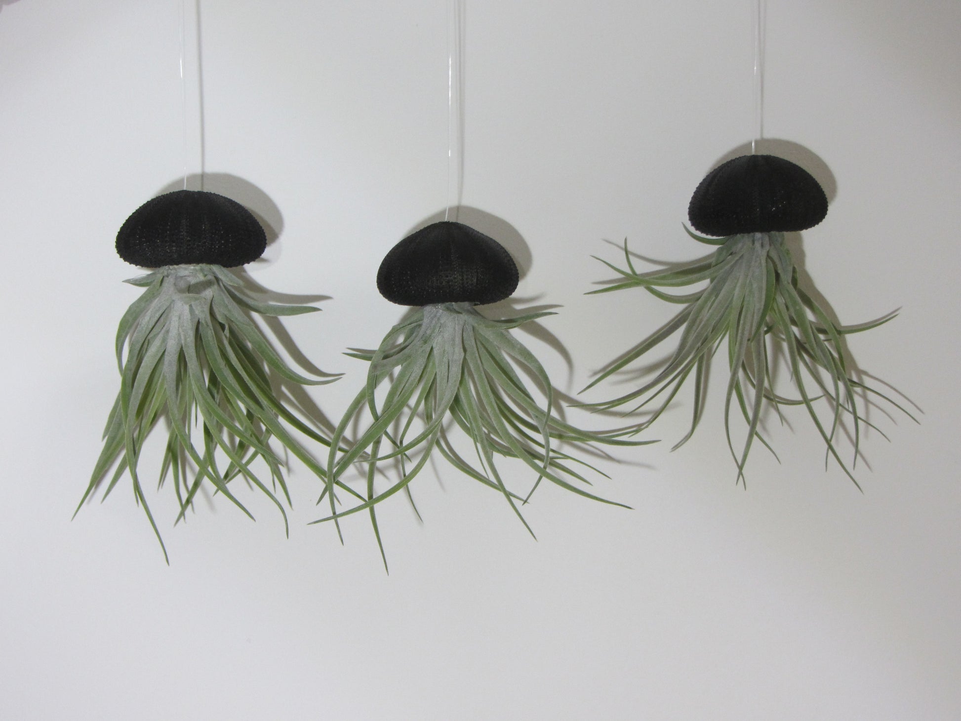 3er Set bezaubernde Kombination aus Seeigelgehäuse schwarz und jeweils einer echten, lebenden Tillandsie mit Aufhängung