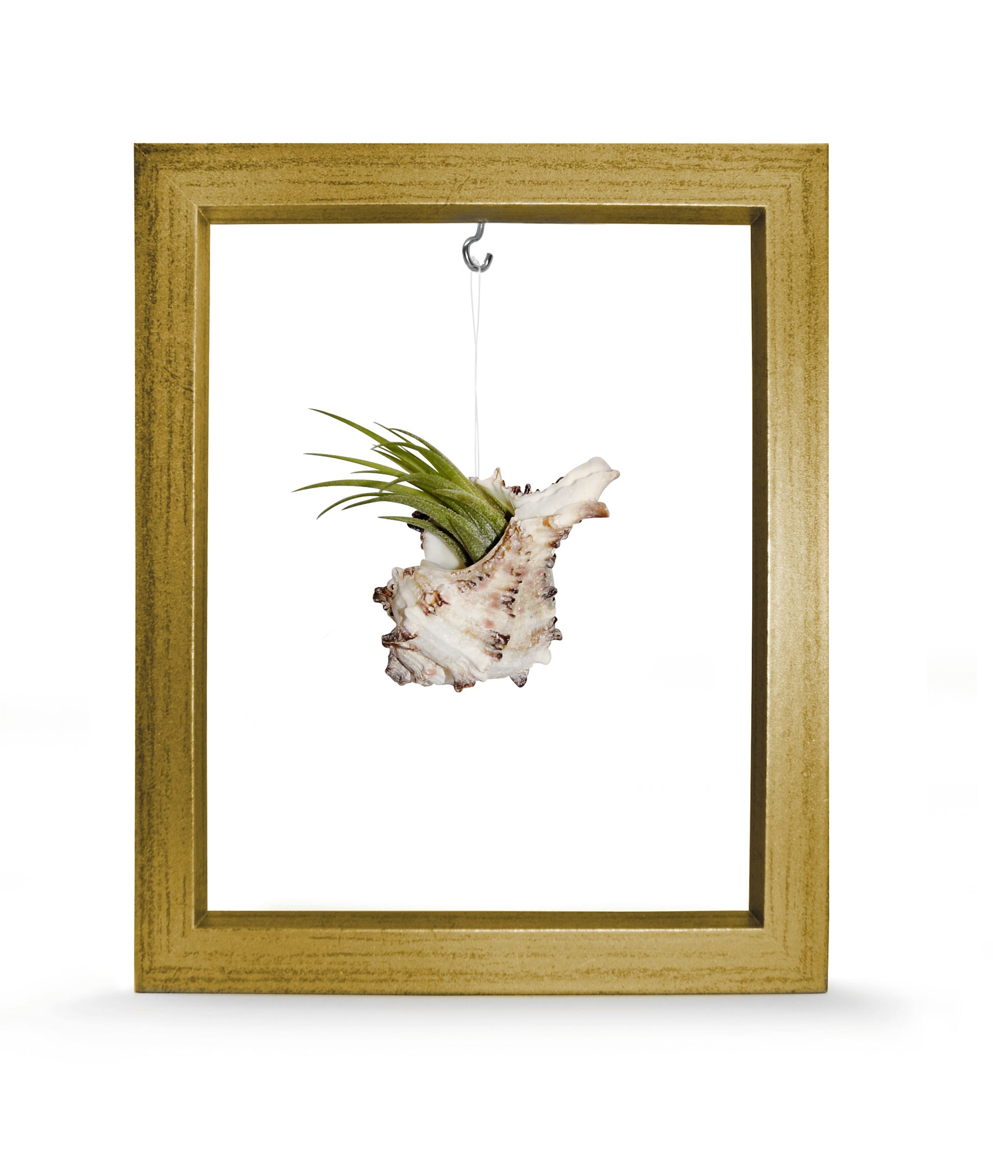 Außergewöhnliche Kombination aus einer Echten Muschel und einer lebenden Tillandsie im Rahmen gold