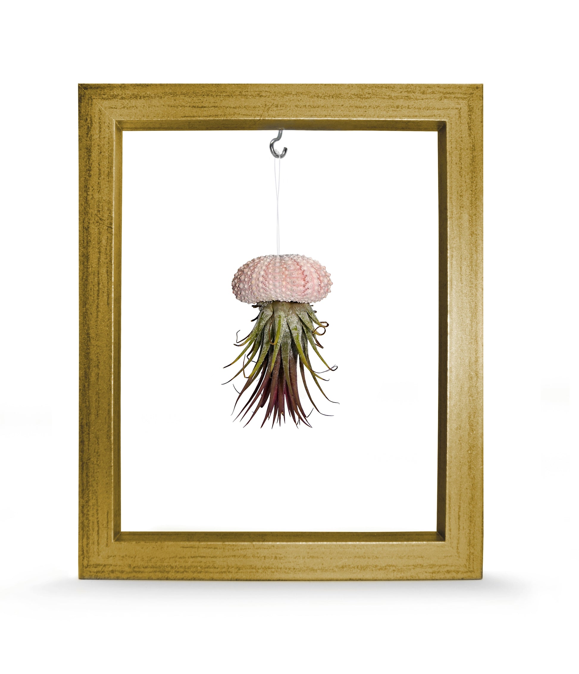 Kombination aus Seeigelgehäuse rosa und Tillandsie in Rahmen gold